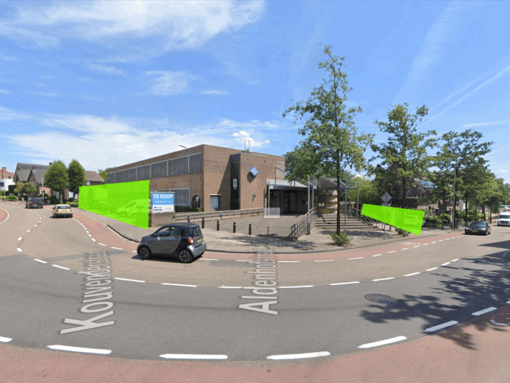 Parkeren doe je gratis links of rechts naast onze hoofdingang. Zie de groene vlakken op onderstaande foto.